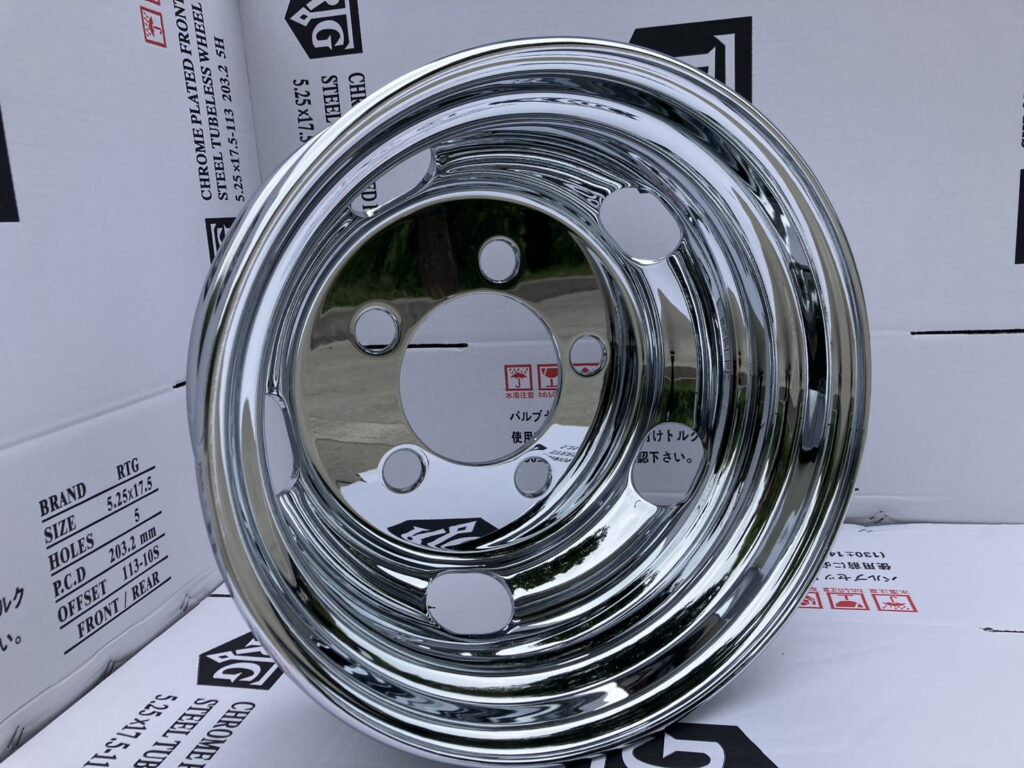 下記写真は、5.25 x 17.5-113 5H P.C.D203.2 リア用クロームメッキホイールの検品合格品です。