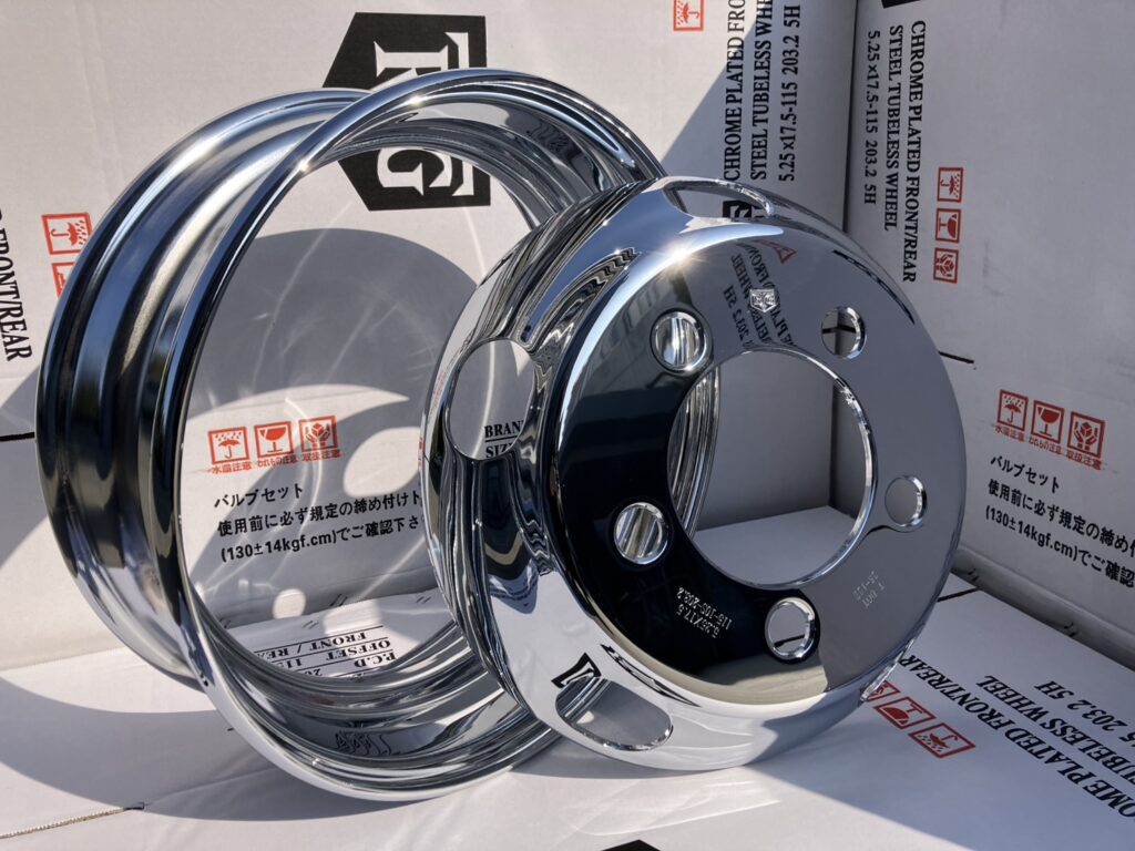 下記写真は、5.25 x 17.5-115 5H P.C.D.203.2フロント用クロームメッキホイールの溶接前です。